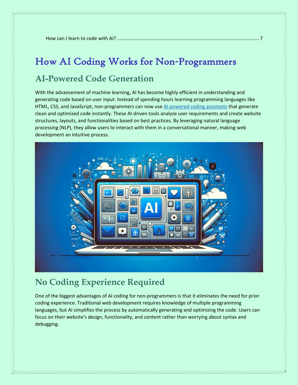 How can I learn to code with AI? .......................................................................................................... 7 How AI Coding Works for Non How AI Coding Works for Non- -Programmers Programmers AI-Powered Code Generation With the advancement of machine learning, AI has become highly efficient in understanding and generating code based on user input. Instead of spending hours learning programming languages like HTML, CSS, and JavaScript, non-programmers can now use AI-powered coding assistants that generate clean and optimized code instantly. These AI-driven tools analyze user requirements and create website structures, layouts, and functionalities based on best practices. By leveraging natural language processing (NLP), they allow users to interact with them in a conversational manner, making web development an intuitive process. No Coding Experience Required One of the biggest advantages of AI coding for non-programmers is that it eliminates the need for prior coding experience. Traditional web development requires knowledge of multiple programming languages, but AI simplifies the process by automatically generating and optimizing the code. Users can focus on their website's design, functionality, and content rather than worrying about syntax and debugging.