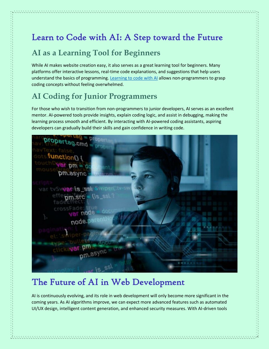 Learn to Code with AI: A Step Learn to Code with AI: A Step toward toward the Future the Future AI as a Learning Tool for Beginners While AI makes website creation easy, it also serves as a great learning tool for beginners. Many platforms offer interactive lessons, real-time code explanations, and suggestions that help users understand the basics of programming. Learning to code with AI allows non-programmers to grasp coding concepts without feeling overwhelmed. AI Coding for Junior Programmers For those who wish to transition from non-programmers to junior developers, AI serves as an excellent mentor. AI-powered tools provide insights, explain coding logic, and assist in debugging, making the learning process smooth and efficient. By interacting with AI-powered coding assistants, aspiring developers can gradually build their skills and gain confidence in writing code. The Future of AI in Web Development The Future of AI in Web Development AI is continuously evolving, and its role in web development will only become more significant in the coming years. As AI algorithms improve, we can expect more advanced features such as automated UI/UX design, intelligent content generation, and enhanced security measures. With AI-driven tools
