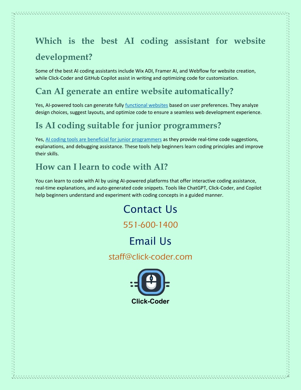 Which is the best AI coding assistant for website development? Some of the best AI coding assistants include Wix ADI, Framer AI, and Webflow for website creation, while Click-Coder and GitHub Copilot assist in writing and optimizing code for customization. Can AI generate an entire website automatically? Yes, AI-powered tools can generate fully functional websites based on user preferences. They analyze design choices, suggest layouts, and optimize code to ensure a seamless web development experience. Is AI coding suitable for junior programmers? Yes, AI coding tools are beneficial for junior programmers as they provide real-time code suggestions, explanations, and debugging assistance. These tools help beginners learn coding principles and improve their skills. How can I learn to code with AI? You can learn to code with AI by using AI-powered platforms that offer interactive coding assistance, real-time explanations, and auto-generated code snippets. Tools like ChatGPT, Click-Coder, and Copilot help beginners understand and experiment with coding concepts in a guided manner. Contact Us 551-600-1400 Email Us staff@click-coder.com