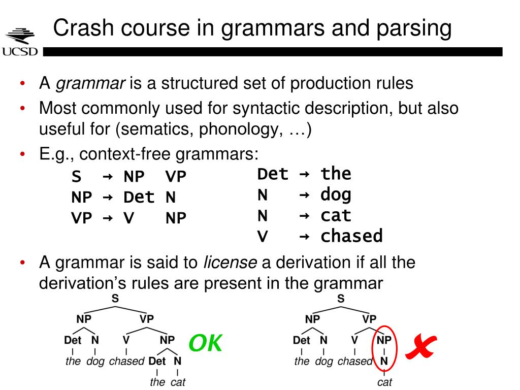 Crash course in grammars and parsing • A grammar is a structured set of production rules • Most commonly used for syntactic description, but also useful for (sematics, phonology, …) • E.g., context-free grammars: • A grammar is said to license a derivation if all the derivation’s rules are present in the grammar Det → the N → dog N → cat V → chased S → NP VP NP → Det N VP → V NP OK