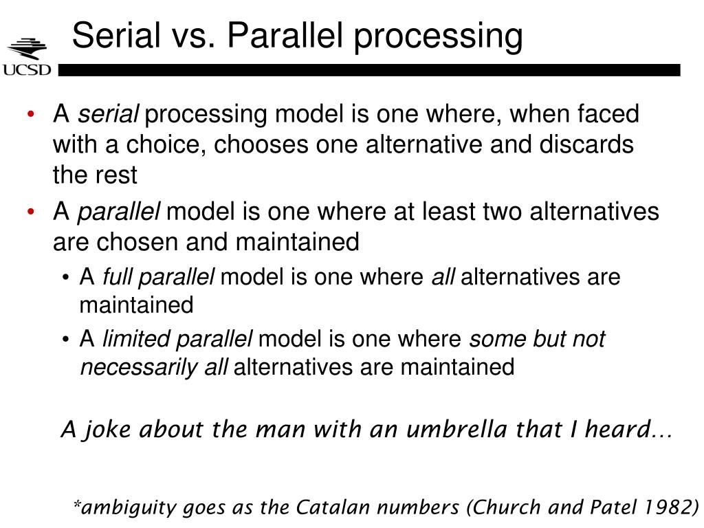 Serial vs. Parallel processing • A serial processing model is one where, when faced with a choice, chooses one alternative and discards the rest • A parallel model is one where at least two alternatives are chosen and maintained • A full parallel model is one where all alternatives are maintained • A limited parallel model is one where some but not necessarily all alternatives are maintained A joke about the man with an umbrella that I heard… *ambiguity goes as the Catalan numbers (Church and Patel 1982)