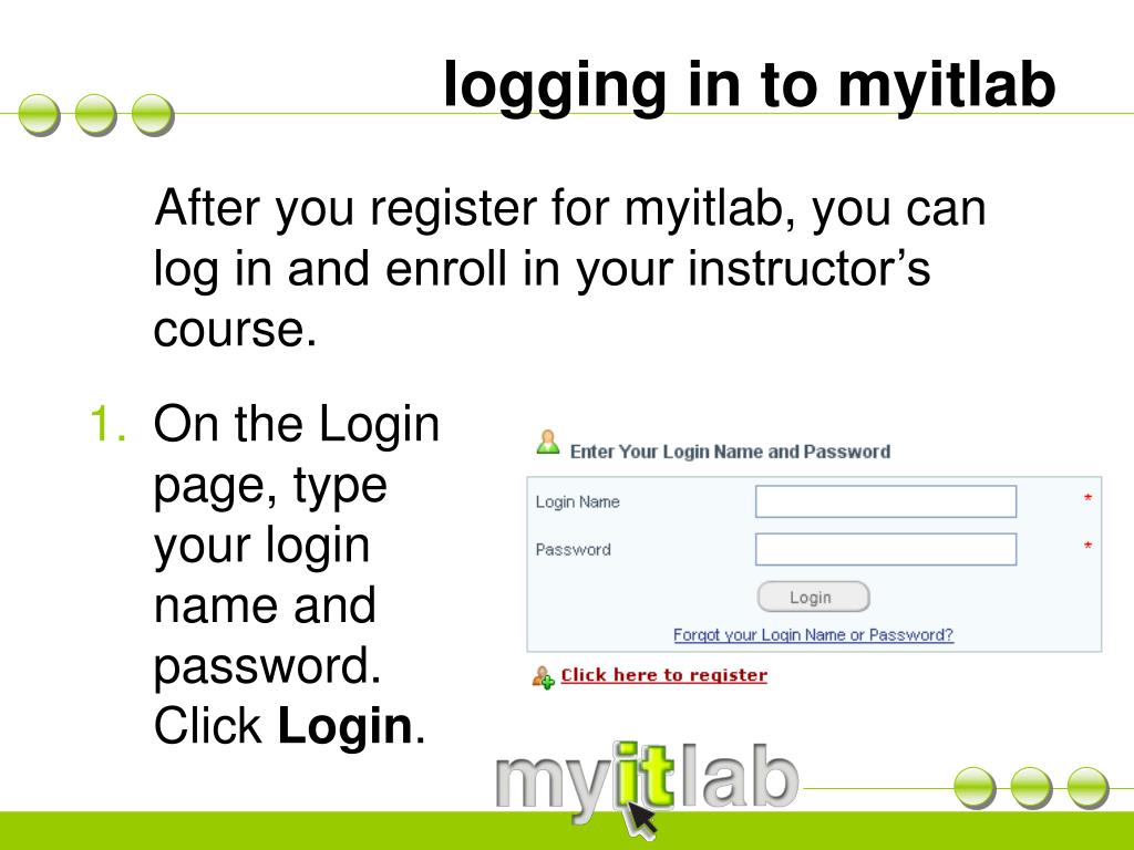 logging in to myitlab After you register for myitlab, you can log in and enroll in your instructor’s course. On the Login page, type your login name and password. Click Login.