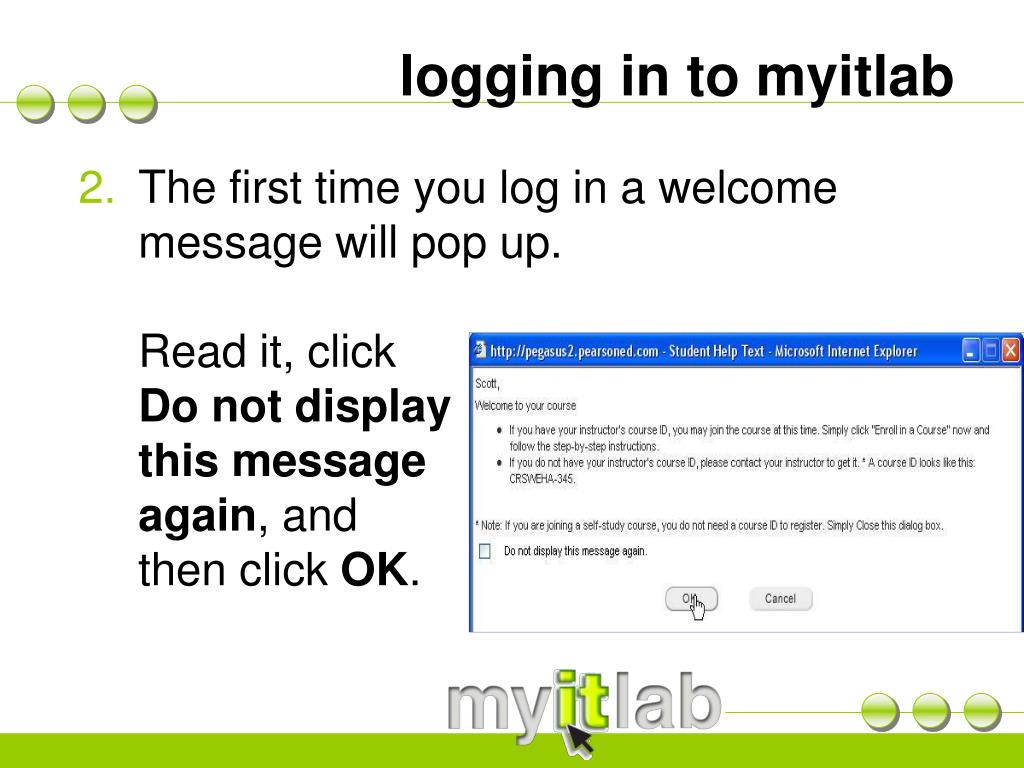 logging in to myitlab The first time you log in a welcome message will pop up. Read it, click Do not display this message again, and then click OK.