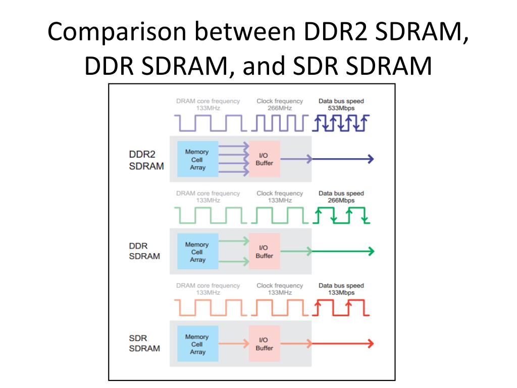 DDR2 • Like all SDRAM implementations, DDR2 stores data in memory cells that are activated with the use of a clock signal to synchronize their operation with an external data bus. • DDR2 I/O buffer transfers data both on the rising and falling edges of the clock signal • The key difference is that for DDR2 the memory cells are clocked at 1 quarter (rather than half) the rate of the bus. • This requires a 4-bit-deep prefetch queue, but, without changing the memory cells themselves, • DDR2 can effectively operate at twice the bus speed of DDR.