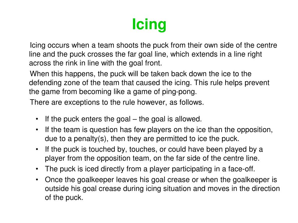 Icing • Icing occurs when a team shoots the puck from their own side of the centre line and the puck crosses the far goal line, which extends in a line right across the rink in line with the goal front. • When this happens, the puck will be taken back down the ice to the defending zone of the team that caused the icing. This rule helps prevent the game from becoming like a game of ping-pong. • There are exceptions to the rule however, as follows. • If the puck enters the goal – the goal is allowed. • If the team is question has few players on the ice than the opposition, due to a penalty(s), then they are permitted to ice the puck. • If the puck is touched by, touches, or could have been played by a player from the opposition team, on the far side of the centre line. • The puck is iced directly from a player participating in a face-off. • Once the goalkeeper leaves his goal crease or when the goalkeeper is outside his goal crease during icing situation and moves in the direction of the puck.