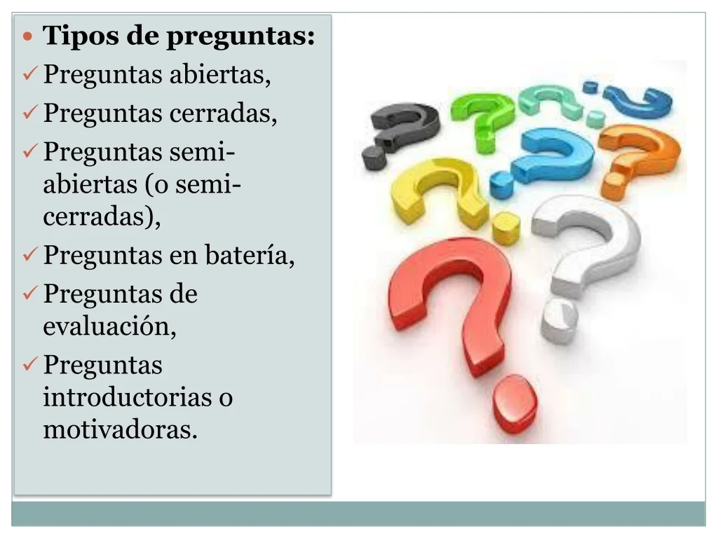 Tipos de preguntas: • Preguntas abiertas, • Preguntas cerradas, • Preguntas semi-abiertas (o semi-cerradas), • Preguntas en batería, • Preguntas de evaluación, • Preguntas introductorias o motivadoras.