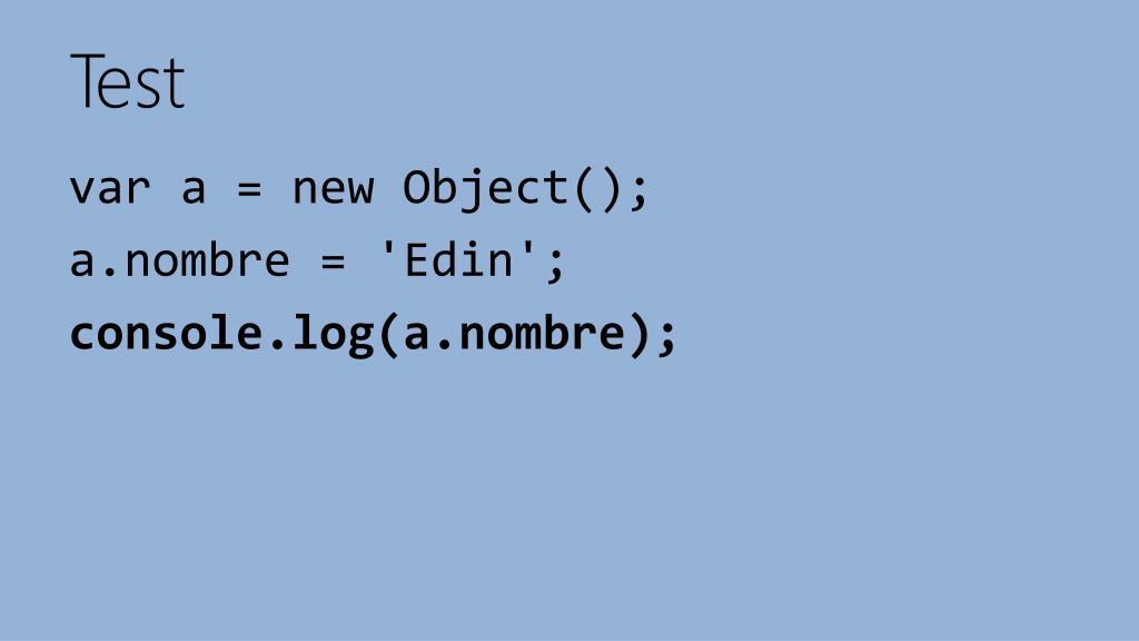 Test var a = new Object(); a.nombre = 'Edin'; console.log(a.nombre);