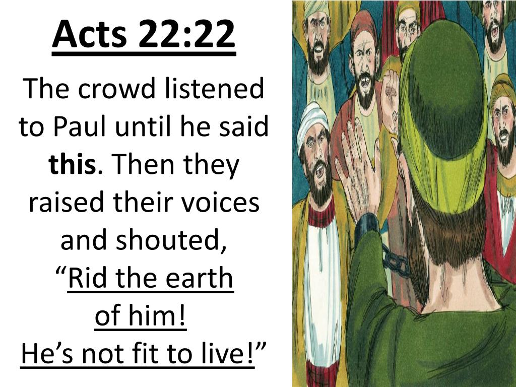 Acts 22:22 The crowd listened to Paul until he said this. Then they raised their voices and shouted, “Rid the earth of him! He’s not fit to live!”