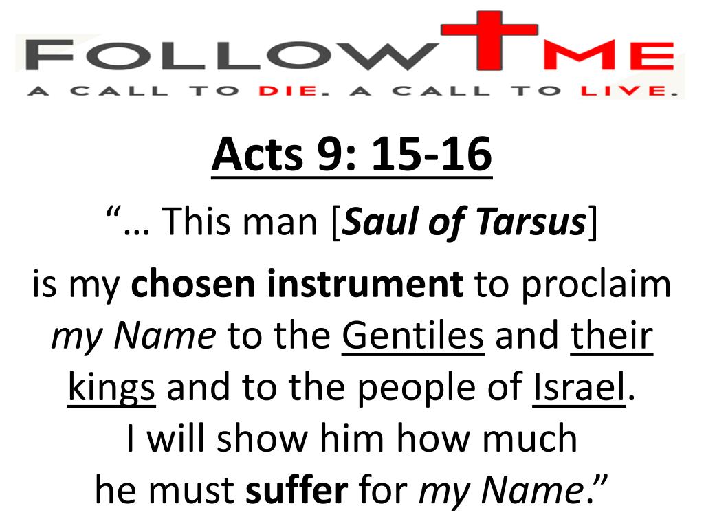 Acts 9: 15-16 “… This man [Saul of Tarsus] is my chosen instrumentto proclaim my Name to the Gentiles and their kings and to the people of Israel. I will show him how much he must suffer for my Name.”