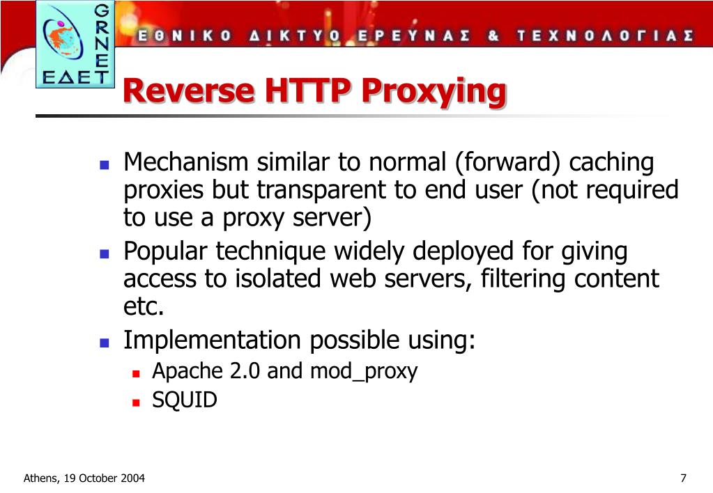 Reverse HTTP Proxying • Mechanism similar to normal (forward) caching proxies but transparent to end user (not required to use a proxy server) • Popular technique widely deployed for giving access to isolated web servers, filtering content etc. • Implementation possible using: • Apache 2.0 and mod_proxy • SQUID