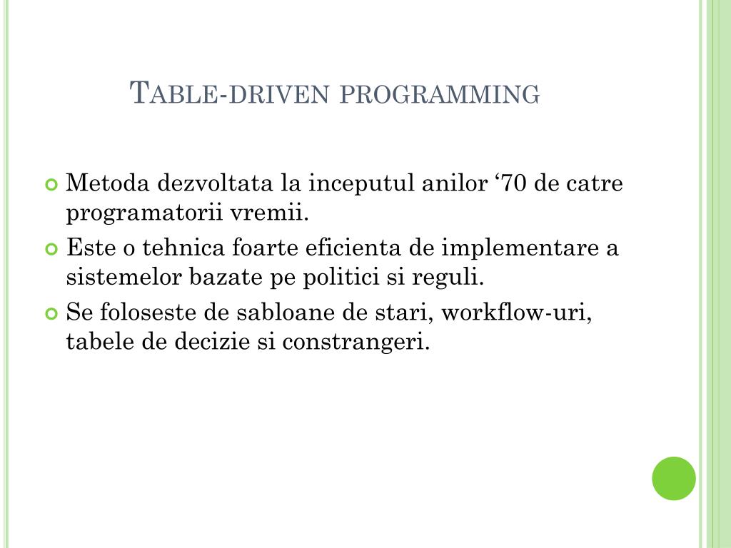 Table-driven programming • Metodadezvoltata la inceputulanilor ‘70 de catreprogramatoriivremii. • Este o tehnicafoarteeficienta de implementare a sistemelorbazatepepoliticisireguli. • Se foloseste de sabloane de stari, workflow-uri, tabele de deciziesiconstrangeri.
