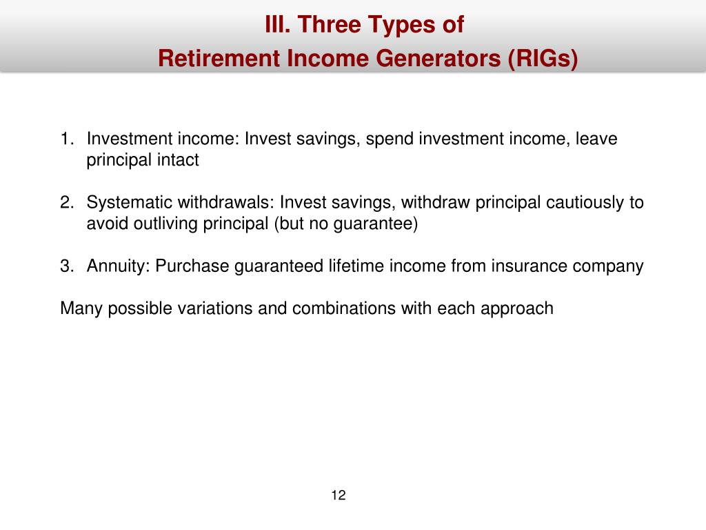 III. Three Types of • Retirement Income Generators (RIGs) Investment income: Invest savings, spend investment income, leave principal intact Systematic withdrawals: Invest savings, withdraw principal cautiously to avoid outliving principal (but no guarantee) Annuity: Purchase guaranteed lifetime income from insurance company Many possible variations and combinations with each approach