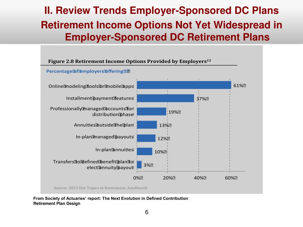 II. Review Trends Employer-Sponsored DC Plans • Retirement Income Options Not Yet Widespread in Employer-Sponsored DC Retirement Plans From Society of Actuaries’ report: The Next Evolution in Defined Contribution Retirement Plan Design