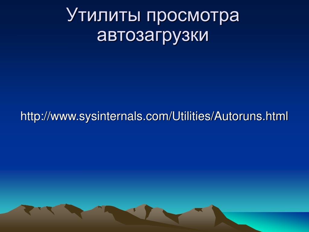Типичные места автозапуска: 1. реестр 2. папка "автозагрузка" 3. файлы system.ini и win.ini 4. запускаемые службы и приложения 5. макросы автозапуска MS Office 6. расширения Internet Explorer Как (и где) вирусы запускаются на компьютере?