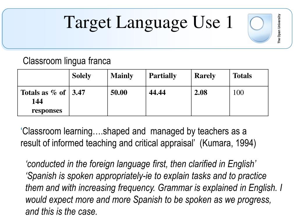 Target Language Use 1 • Classroom lingua franca ‘Classroom learning….shaped and managed by teachers as a result of informed teaching and critical appraisal’ (Kumara, 1994) ‘conducted in the foreign language first, then clarified in English’ ‘Spanish is spoken appropriately-ie to explain tasks and to practice them and with increasing frequency. Grammar is explained in English. I would expect more and more Spanish to be spoken as we progress, and this is the case.