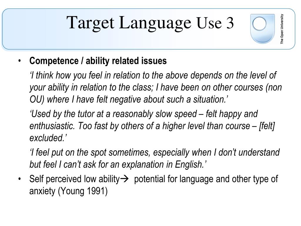 Competence / ability related issues ‘I think how you feel in relation to the above depends on the level of your ability in relation to the class; I have been on other courses (non OU) where I have felt negative about such a situation.’ ‘Used by the tutor at a reasonably slow speed – felt happy and enthusiastic. Too fast by others of a higher level than course – [felt] excluded.’ ‘I feel put on the spot sometimes, especially when I don’t understand but feel I can’t ask for an explanation in English.’ Self perceived low ability potential for language and other type of anxiety (Young 1991) Target Language Use 3