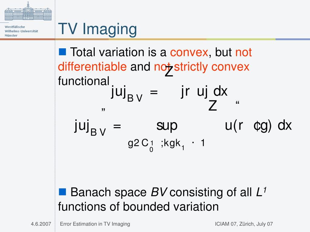 TV Imaging Z Z j j j j j j ( ) d d r r ¢ u u s u p u u x g x = = B V B V k k C · 1 1 2 g g 1 0 ; • Total variation is a convex, but not differentiable and not strictly convex functional „ “ • Banach space BV consisting of all L1 functions of bounded variation Error Estimation in TV Imaging ICIAM 07, Zürich, July 07