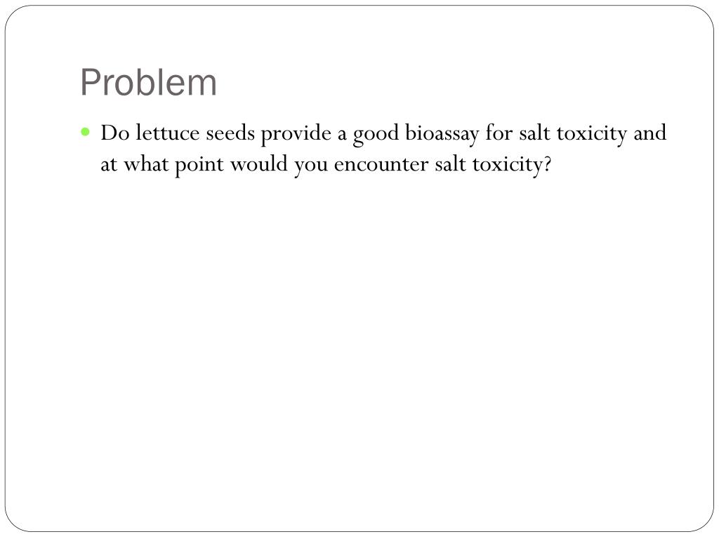 Problem • Do lettuce seeds provide a good bioassay for salt toxicity and at what point would you encounter salt toxicity?