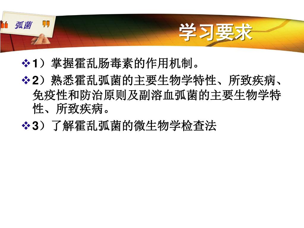 学习要求 • 1)掌握霍乱肠毒素的作用机制。 • 2)熟悉霍乱弧菌的主要生物学特性、所致疾病、免疫性和防治原则及副溶血弧菌的主要生物学特性、所致疾病。 • 3)了解霍乱弧菌的微生物学检查法
