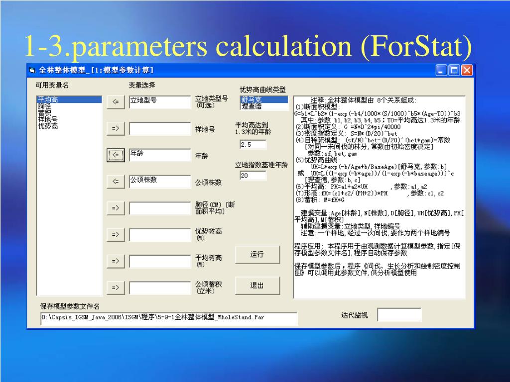 ISGM model in ForStat software (Chinese) Two main parts : 1. From the measurement data to calculate all the parameters in ISGM model . 2. To simulate the normal stand growth , thinning growth and draw the DensityControlGraph.