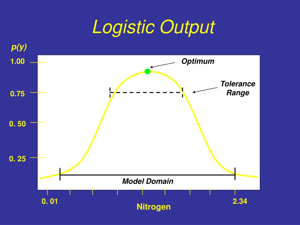 1.00 0.75 0. 50 0. 25 0. 01 2.34 Nitrogen Logistic Output p(y) Optimum Tolerance Range Model Domain