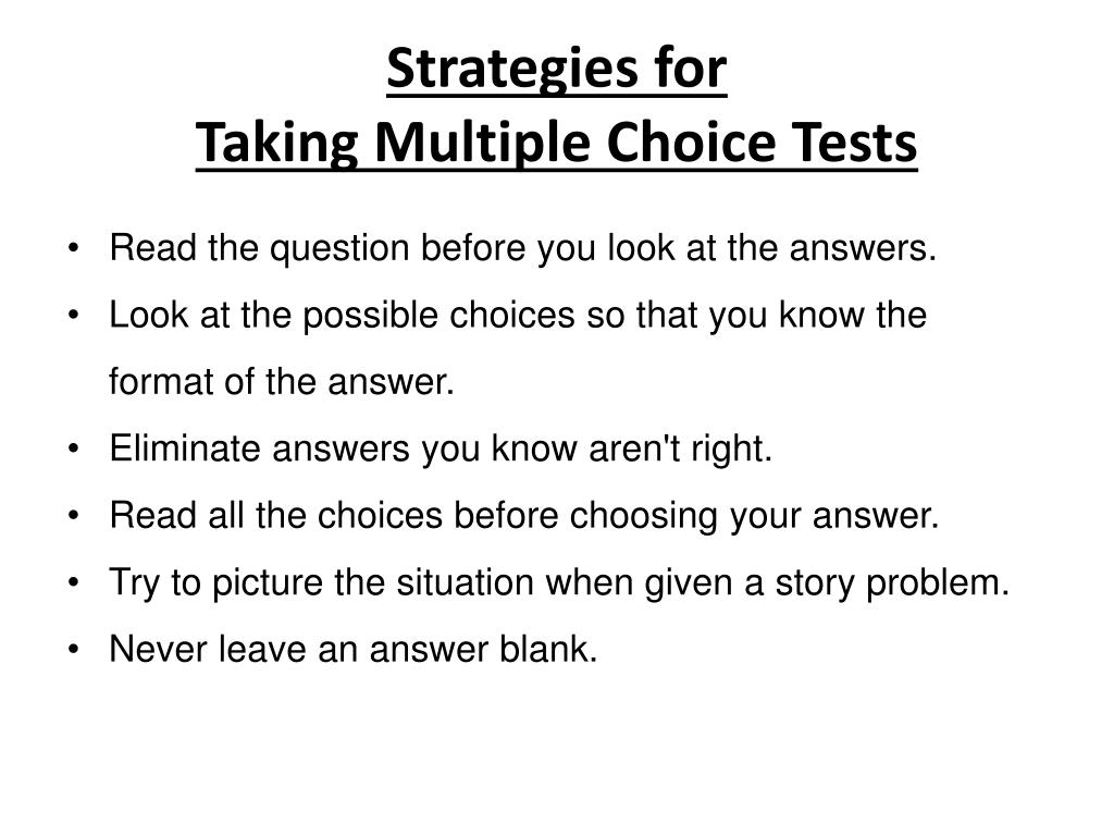 Strategies for Taking Multiple Choice Tests • Read the question before you look at the answers. • Look at the possible choices so that you know the format of the answer. • Eliminate answers you know aren't right. • Read all the choices before choosing your answer. • Try to picture the situation when given a story problem. • Never leave an answer blank.