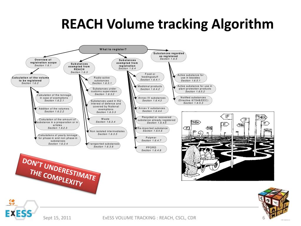 Why Volume trackingand … what's the problem then ? Knowledge of origin : Collection of data per LE is not obvious Principle of “ similar substances “ accepted in REACH Data on compositions … many companies don’t know Data on exemptions and rules Composition depending Substance role for REACH BOM not known …. Fast automated detection of SVHC DON’T UNDERESTIMATE THE COMPLEXITY ExESS VOLUME TRACKING : REACH, CSCL, CDR