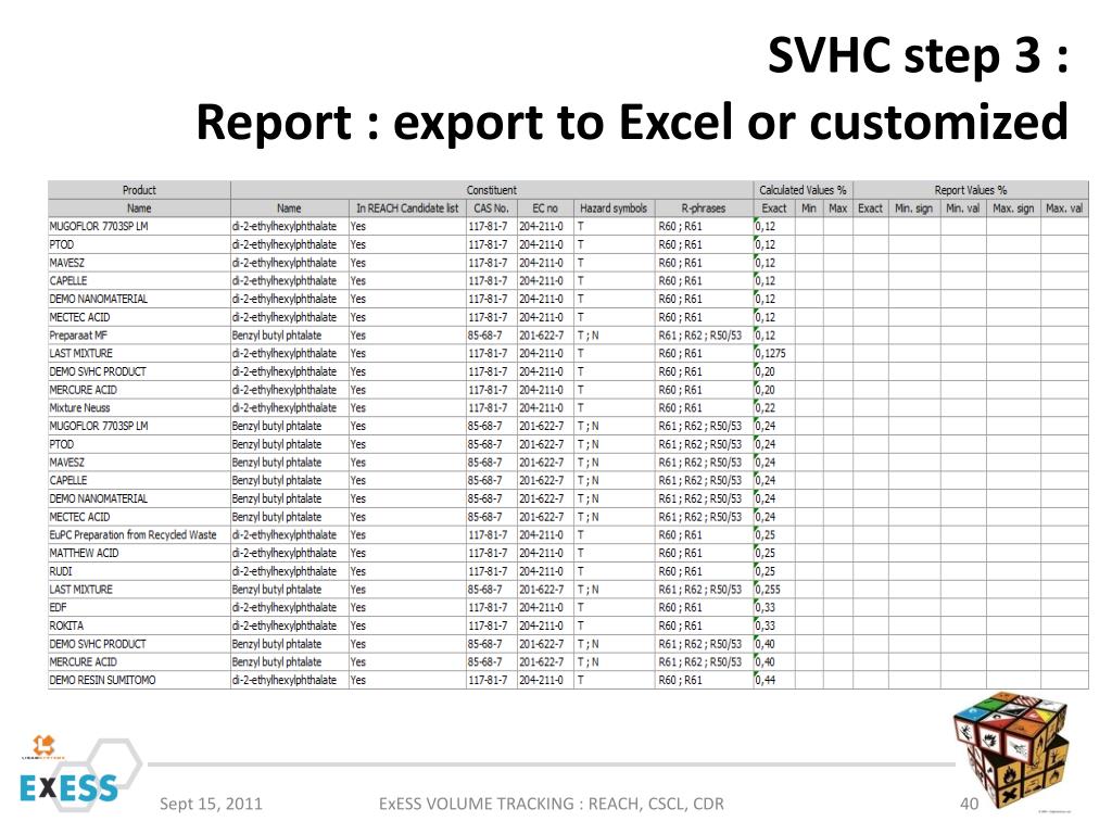 SVHC step 3 : Report : export to Excel or customized ExESS VOLUME TRACKING : REACH, CSCL, CDR