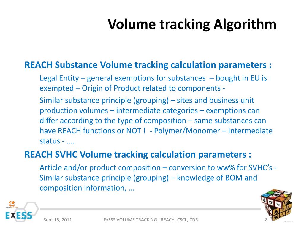 Volume tracking Algorithm REACH Substance Volume tracking calculation parameters : Legal Entity – general exemptions for substances – bought in EU is exempted – Origin of Product related to components - Similar substance principle (grouping) – sites and business unit production volumes – intermediate categories – exemptions can differ according to the type of composition – same substances can have REACH functions or NOT ! - Polymer/Monomer – Intermediate status - …. REACH SVHC Volume tracking calculation parameters : Article and/or product composition – conversion to ww% for SVHC’s - Similar substance principle (grouping) – knowledge of BOM and composition information, … ExESS VOLUME TRACKING : REACH, CSCL, CDR