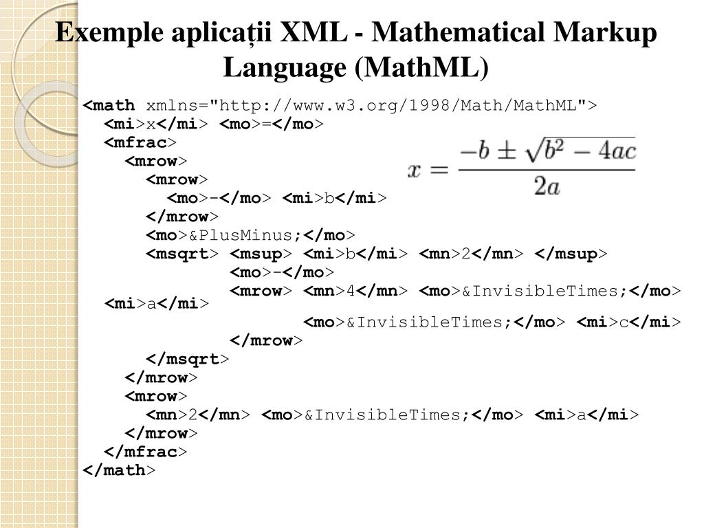Exemple aplicații XML - Mathematical Markup Language (MathML) <mathxmlns="http://www.w3.org/1998/Math/MathML"> <mi>x</mi> <mo>=</mo> <mfrac> <mrow> <mrow> <mo>-</mo> <mi>b</mi> </mrow> <mo>±</mo> <msqrt> <msup> <mi>b</mi> <mn>2</mn> </msup> <mo>-</mo> <mrow> <mn>4</mn> <mo>⁢</mo> <mi>a</mi> <mo>⁢</mo> <mi>c</mi> </mrow> </msqrt> </mrow> <mrow> <mn>2</mn> <mo>⁢</mo> <mi>a</mi> </mrow> </mfrac> </math>
