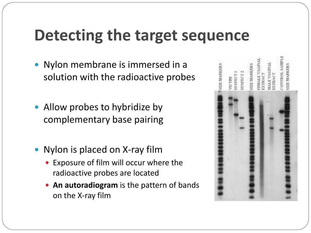 Detecting the target sequence • Nylon membrane is immersed in a solution with the radioactive probes • Allow probes to hybridize by complementary base pairing • Nylon is placed on X-ray film • Exposure of film will occur where the radioactive probes are located • An autoradiogram is the pattern of bands on the X-ray film