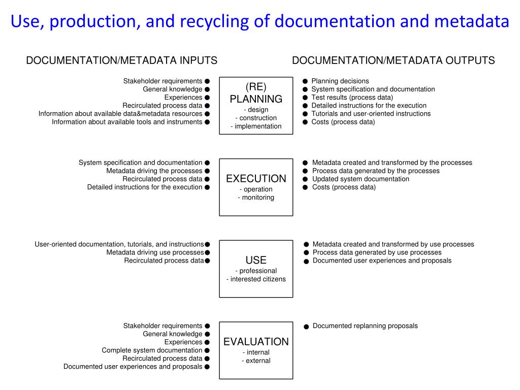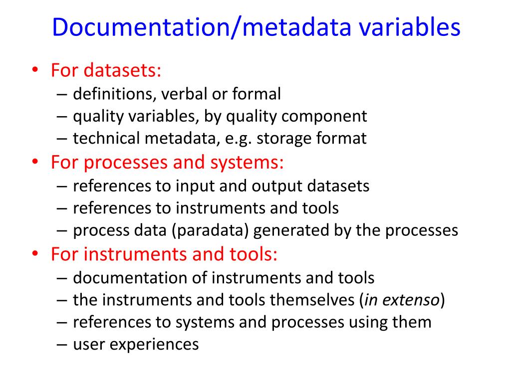 Documentation/metadata variables • For datasets: • definitions, verbal or formal • quality variables, by quality component • technical metadata, e.g. storage format • For processes and systems: • references to input and output datasets • references to instruments and tools • process data (paradata) generated by the processes • For instruments and tools: • documentation of instruments and tools • the instruments and tools themselves (in extenso) • references to systems and processes using them • user experiences