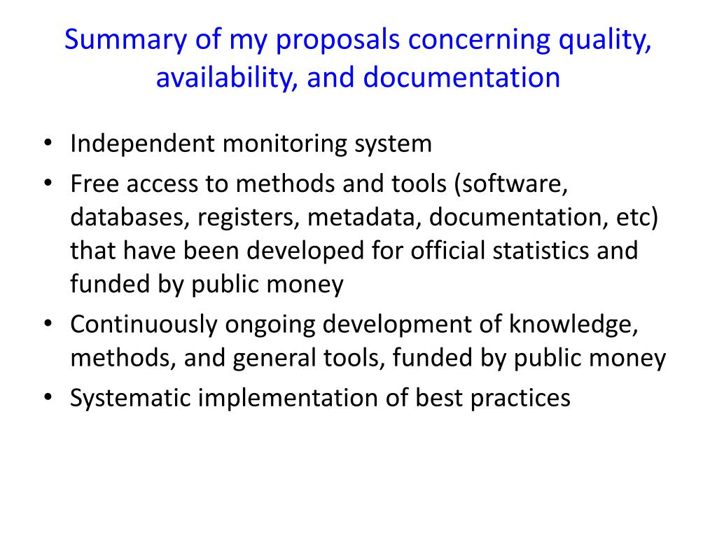 Summary of my proposals concerning quality, availability, and documentation • Independent monitoring system • Free access to methods and tools (software, databases, registers, metadata, documentation, etc) that have been developed for official statistics and funded by public money • Continuously ongoing development of knowledge, methods, and general tools, funded by public money • Systematic implementation of best practices