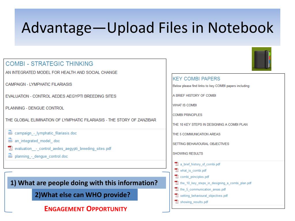 Advantage—Upload Files in Notebook 1) What are people doing with this information? 2)What else can WHO provide? Engagement Opportunity