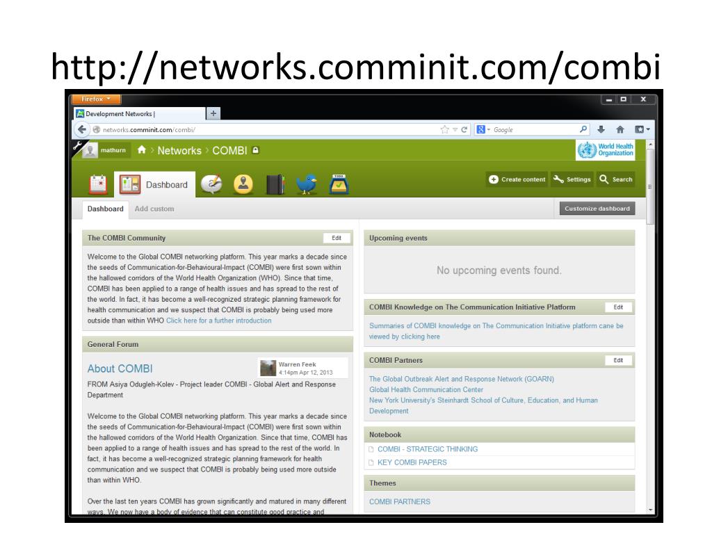 COMBI Online Engagement Strategy. Developed March – May 2013 Neesha Mathur , Intern for Asiya Odugleh-Kolev World Health Organization. http://networks.comminit.com/combi. Content Management. Calendar. Dashboard provides overview of all other categories. Benefits : Robust interface