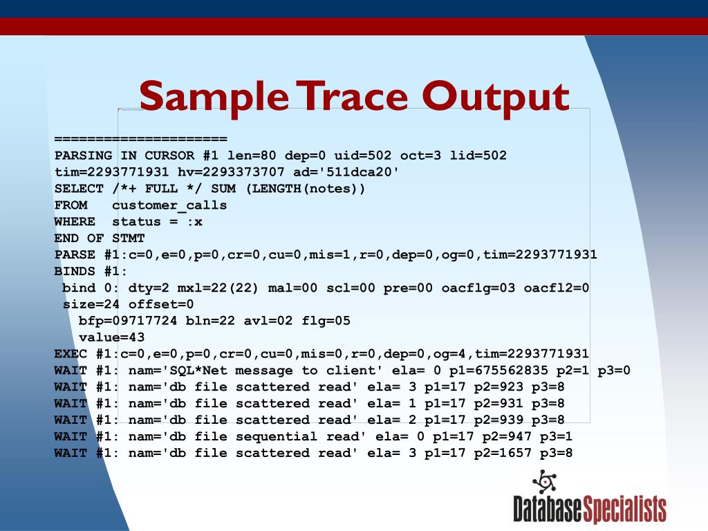 Sample Trace Output ===================== PARSING IN CURSOR #1 len=80 dep=0 uid=502 oct=3 lid=502 tim=2293771931 hv=2293373707 ad='511dca20' SELECT /*+ FULL */ SUM (LENGTH(notes)) FROM customer_calls WHERE status = :x END OF STMT PARSE #1:c=0,e=0,p=0,cr=0,cu=0,mis=1,r=0,dep=0,og=0,tim=2293771931 BINDS #1: bind 0: dty=2 mxl=22(22) mal=00 scl=00 pre=00 oacflg=03 oacfl2=0 size=24 offset=0 bfp=09717724 bln=22 avl=02 flg=05 value=43 EXEC #1:c=0,e=0,p=0,cr=0,cu=0,mis=0,r=0,dep=0,og=4,tim=2293771931 WAIT #1: nam='SQL*Net message to client' ela= 0 p1=675562835 p2=1 p3=0 WAIT #1: nam='db file scattered read' ela= 3 p1=17 p2=923 p3=8 WAIT #1: nam='db file scattered read' ela= 1 p1=17 p2=931 p3=8 WAIT #1: nam='db file scattered read' ela= 2 p1=17 p2=939 p3=8 WAIT #1: nam='db file sequential read' ela= 0 p1=17 p2=947 p3=1 WAIT #1: nam='db file scattered read' ela= 3 p1=17 p2=1657 p3=8