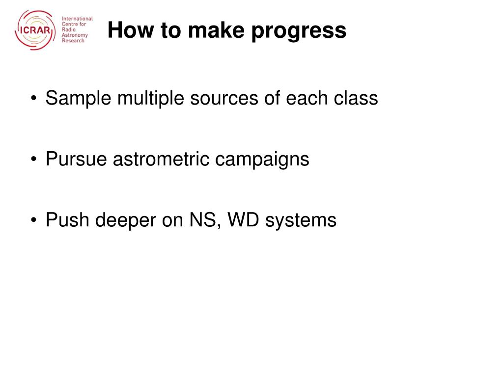 How to make progress • Sample multiple sources of each class • Pursue astrometric campaigns • Push deeper on NS, WD systems