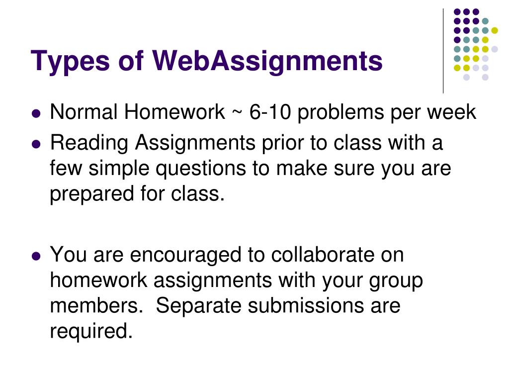 Types of WebAssignments • Normal Homework ~ 6-10 problems per week • Reading Assignments prior to class with a few simple questions to make sure you are prepared for class. • You are encouraged to collaborate on homework assignments with your group members. Separate submissions are required.