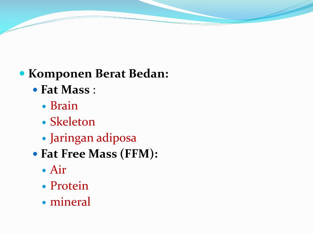 KomponenBeratBedan: • Fat Mass : • Brain • Skeleton • Jaringanadiposa • Fat Free Mass (FFM): • Air • Protein • mineral