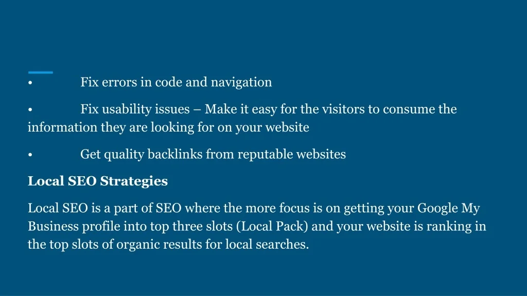 • Fix errors in code and navigation • Fix usability issues – Make it easy for the visitors to consume the information they are looking for on your website • Get quality backlinks from reputable websites Local SEO Strategies Local SEO is a part of SEO where the more focus is on getting your Google My Business profile into top three slots (Local Pack) and your website is ranking in the top slots of organic results for local searches.