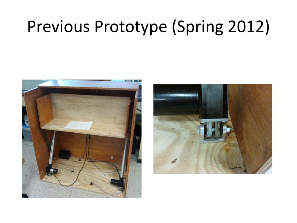 PROJECT HISTORY • Prior to Fall 2012 • Working prototype • Actuators were located at the base(front) of the shelf, reducing desk space • Lack of safety equipment • Shelf was unstable when moving up and down • Current prototype will be modified to meet the required standards for the final prototype