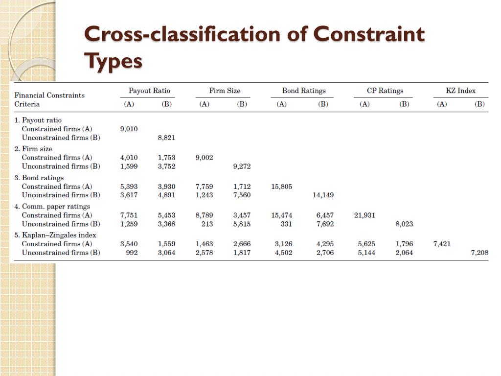 What is financial constraint? • The most precise (but also broadest) definition classifies firms as financially constrained if they face a wedge between the internal and external costs of funds. • A firm is considered more financially constrained as the wedge between its internal and external cost of funds increases. • Fazzari, Hubbard, and Petersen (1988) was the first of many papers to consider higher investment-cash flow sensitivities as evidence of greater financing constraints.