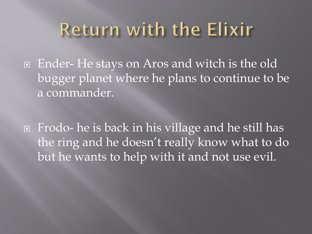 Return with the Elixir • Ender- He stays on Aros and witch is the old bugger planet where he plans to continue to be a commander. • Frodo- he is back in his village and he still has the ring and he doesn’t really know what to do but he wants to help with it and not use evil.