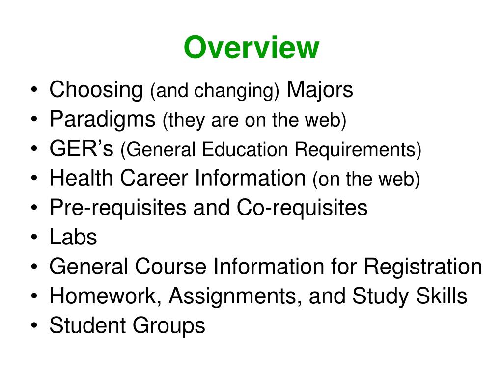 Overview • Choosing (and changing) Majors • Paradigms (they are on the web) • GER’s (General Education Requirements) • Health Career Information (on the web) • Pre-requisites and Co-requisites • Labs • General Course Information for Registration • Homework, Assignments, and Study Skills • Student Groups