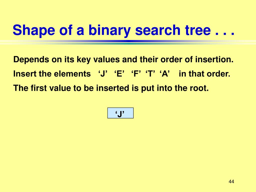 ‘J’ Shape of a binary search tree . . . Depends on its key values and their order of insertion. Insert the elements ‘J’ ‘E’ ‘F’ ‘T’ ‘A’ in that order. The first value to be inserted is put into the root.