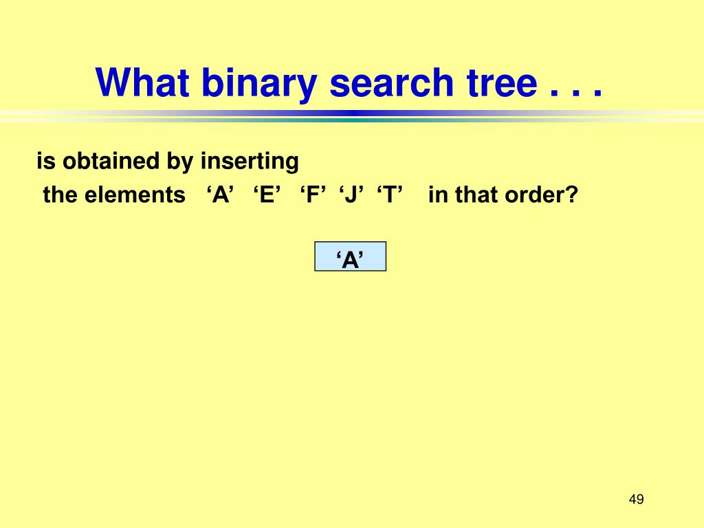 ‘A’ What binary search tree . . . is obtained by inserting the elements ‘A’ ‘E’ ‘F’ ‘J’ ‘T’ in that order?