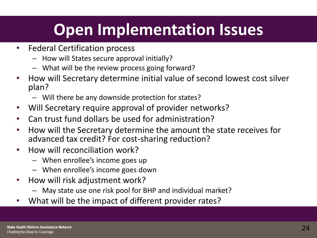 Open Implementation Issues Open Implementation Issues • Federal Certification process • How will States secure approval initially? • What will be the review process going forward? • How will Secretary determine initial value of second lowest cost silver plan? • Will there be any downside protection for states? • Will Secretary require approval of provider networks? • Can trust fund dollars be used for administration? • How will the Secretary determine the amount the state receives for advanced tax credit? For cost-sharing reduction? • How will reconciliation work? • When enrollee’s income goes up • When enrollee’s income goes down • How will risk adjustment work? • May state use one risk pool for BHP and individual market? • What will be the impact of different provider rates? 24