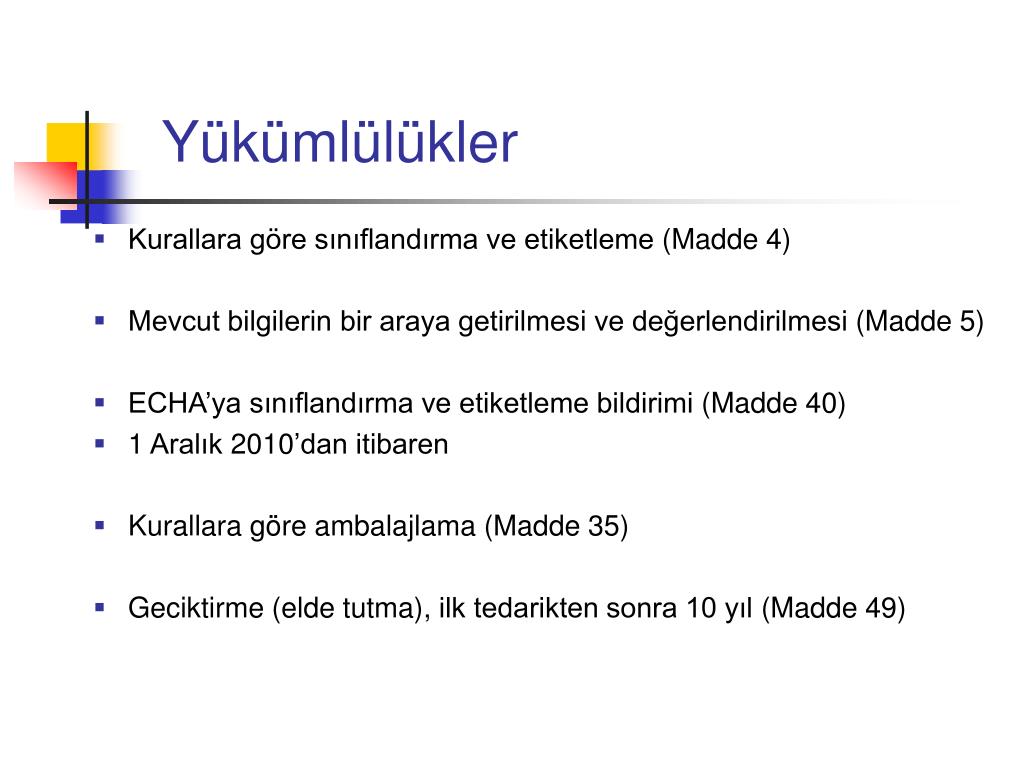 Yükümlülükler • Kurallara göre sınıflandırma ve etiketleme (Madde 4) • Mevcut bilgilerin bir araya getirilmesi ve değerlendirilmesi (Madde 5) • ECHA’ya sınıflandırma ve etiketleme bildirimi (Madde 40) • 1 Aralık 2010’dan itibaren • Kurallara göre ambalajlama (Madde 35) • Geciktirme (elde tutma), ilk tedarikten sonra 10 yıl (Madde 49)