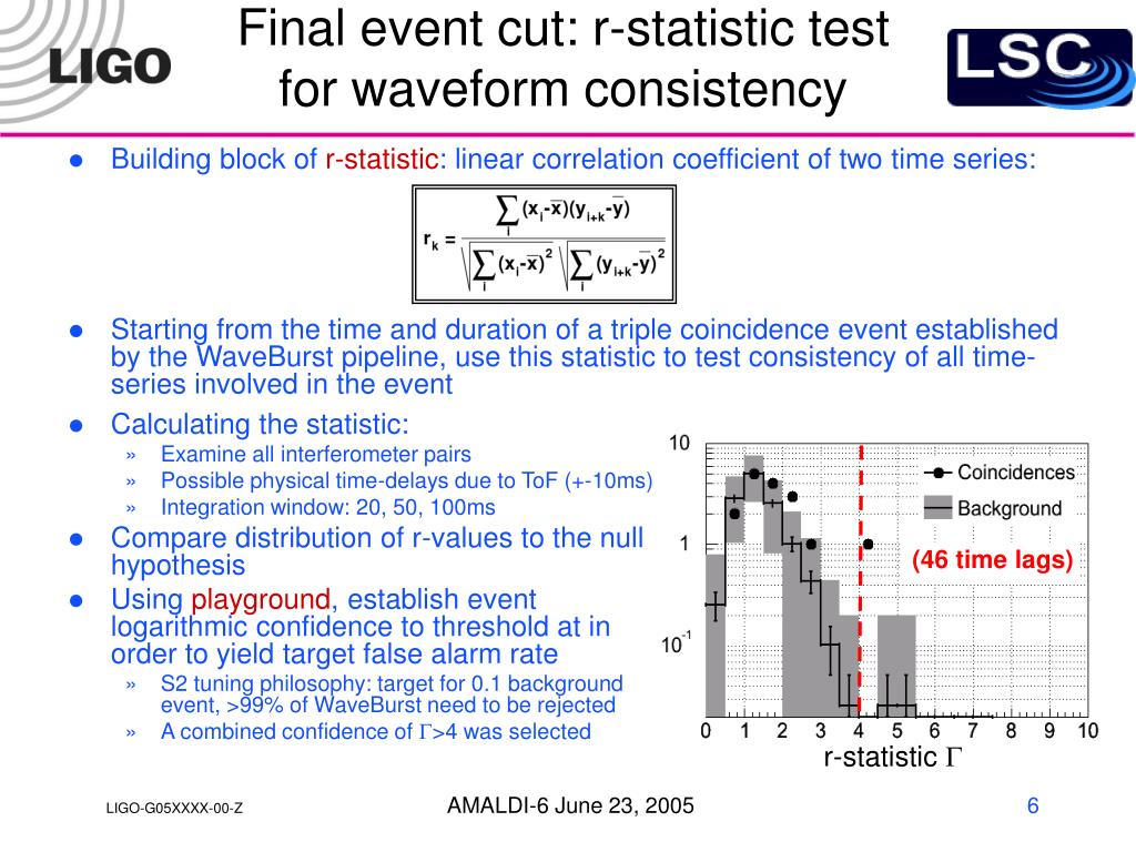 (46 time lags) r-statistic G Final event cut: r-statistic test for waveform consistency • Building block of r-statistic: linear correlation coefficient of two time series: • Starting from the time and duration of a triple coincidence event established by the WaveBurst pipeline, use this statistic to test consistency of all time-series involved in the event • Calculating the statistic: • Examine all interferometer pairs • Possible physical time-delays due to ToF (+-10ms) • Integration window: 20, 50, 100ms • Compare distribution of r-values to the null hypothesis • Using playground, establish event logarithmic confidence to threshold at in order to yield target false alarm rate • S2 tuning philosophy: target for 0.1 background event, >99% of WaveBurst need to be rejected • A combined confidence of G>4 was selected