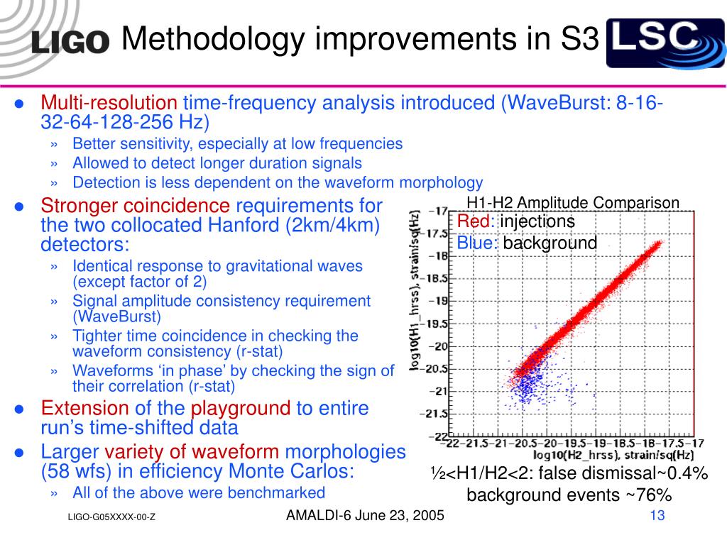 Methodology improvements in S3 • Multi-resolution time-frequency analysis introduced (WaveBurst: 8-16-32-64-128-256 Hz) • Better sensitivity, especially at low frequencies • Allowed to detect longer duration signals • Detection is less dependent on the waveform morphology • Stronger coincidence requirements for the two collocated Hanford (2km/4km) detectors: • Identical response to gravitational waves (except factor of 2) • Signal amplitude consistency requirement (WaveBurst) • Tighter time coincidence in checking the waveform consistency (r-stat) • Waveforms ‘in phase’ by checking the sign of their correlation (r-stat) • Extension of the playground to entire run’s time-shifted data • Larger variety of waveform morphologies (58 wfs) in efficiency Monte Carlos: • All of the above were benchmarked H1-H2 Amplitude Comparison Red: injections Blue: background ½<H1/H2<2: false dismissal~0.4% background events ~76%